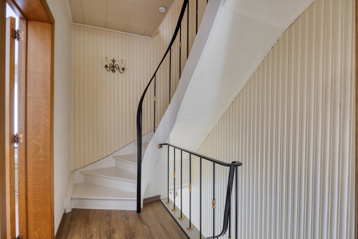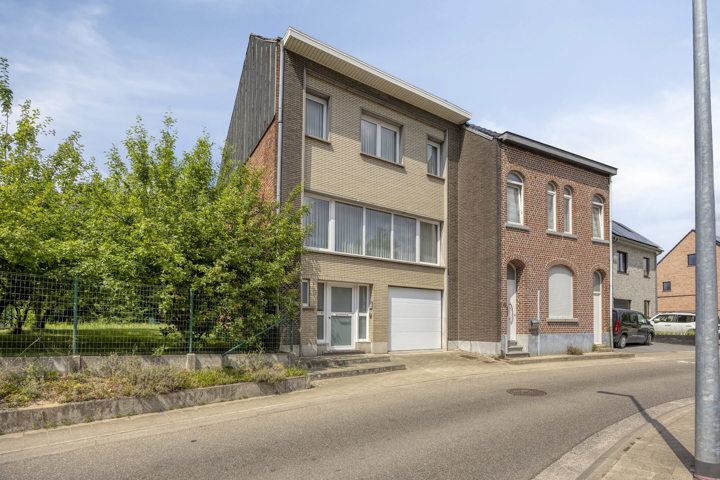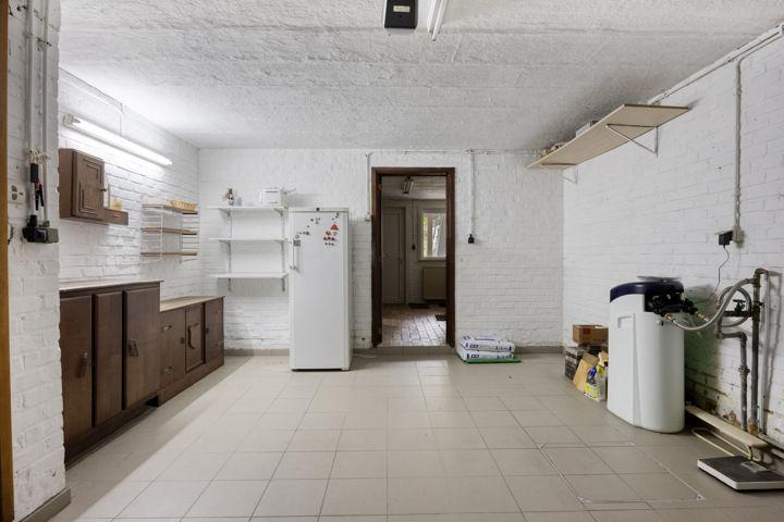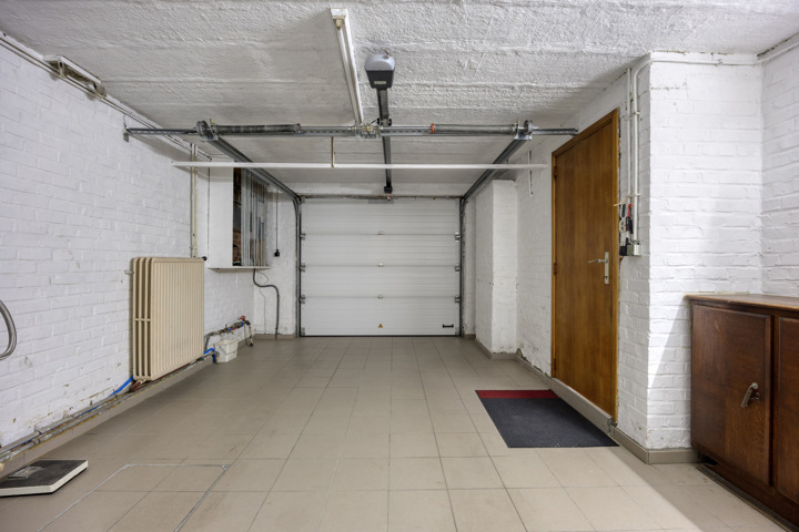 La maison orientée à l'est compte trois étages et un grenier. Le rez-de-chaussée comprend un hall d'entrée avec vestiaire et toilettes, donne accès au garage avec porte sectionnelle et à deux grands débarras qui s'ouvrent sur le jardin.