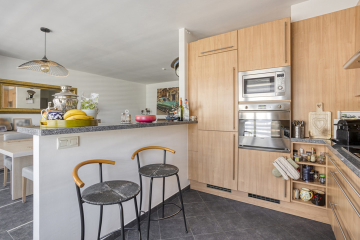 En entrant, on remarque immédiatement l'espace de vie ouvert, baigné de lumière naturelle grâce à de grandes fenêtres. La cuisine attenante, entièrement équipée, dispose de tout le confort nécessaire et forme avec l'espace de vie un lieu harmonieux et agréable pour vivre, cuisiner et se détendre.