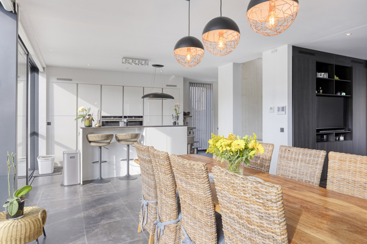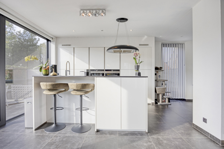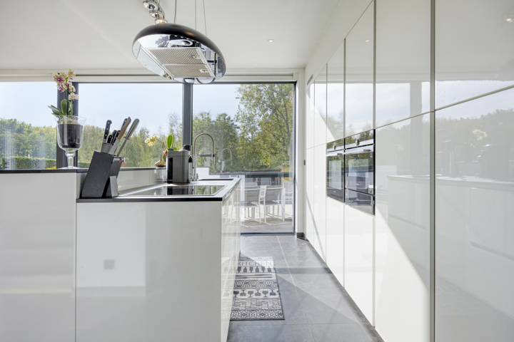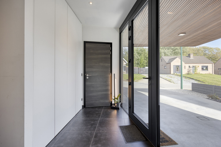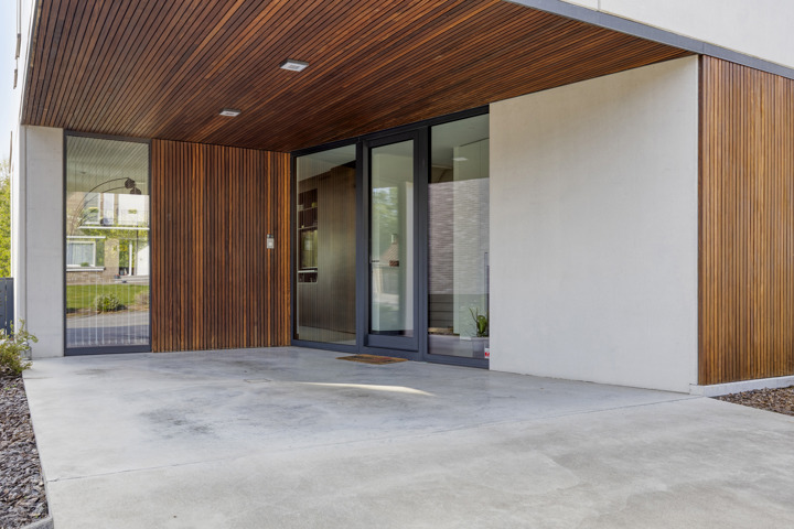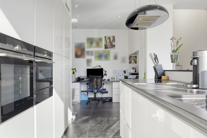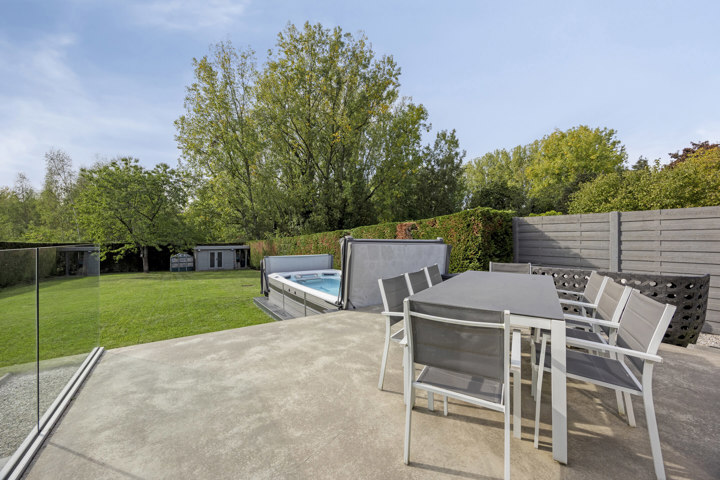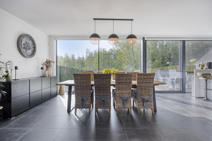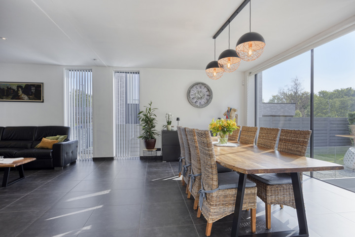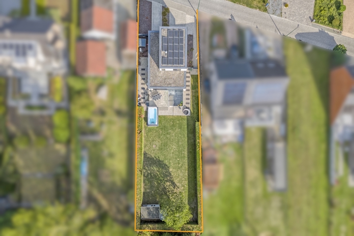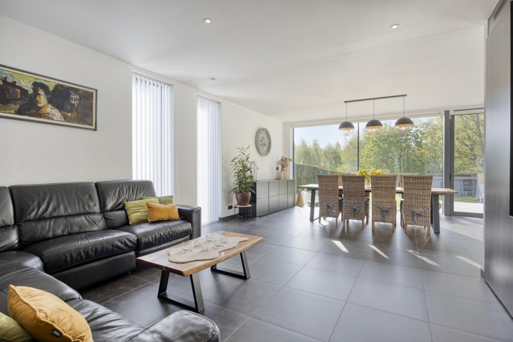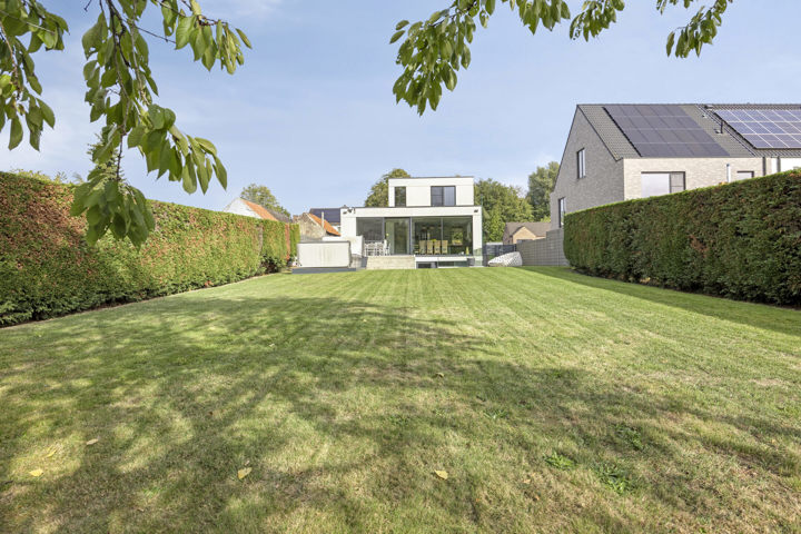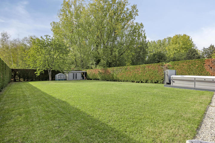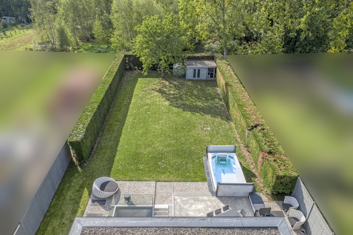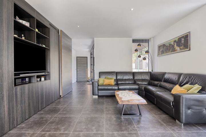 4-façades très récente et extrêmement économe en énergie (niveau E10) offre une vue magnifique sur la verdure. Cette maison moderne allie un confort de vie haut de gamme à des technologies durables telles qu'une pompe à chaleur avec chauffage par le sol, des panneaux solaires et une excellente isolation. Les fenêtres à hauteur de plafond offrent une abondance de lumière naturelle et une connexion harmonieuse avec le jardin et la piscine chauffée avec jet stream.