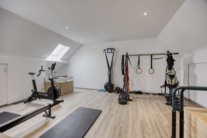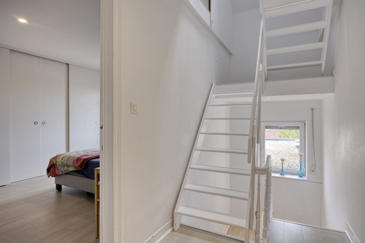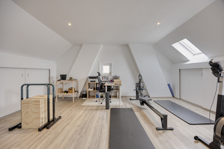 La disposition est la suivante : hall d'entrée, salon lumineux, cuisine moderne, arrière-cuisine/buanderie/local technique pratique et toilettes séparées. Au premier étage se trouvent deux chambres et une salle de bains. Le grenier entièrement aménagé, accessible par un escalier fixe, sert de troisième chambre ou de pièce polyvalente.