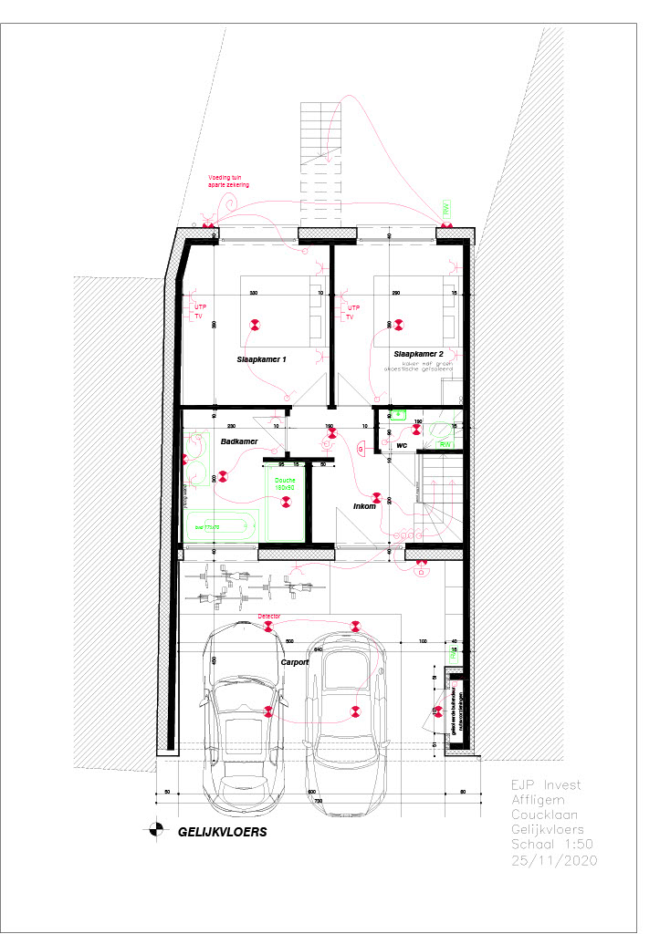 En entrant dans la maison, vous arrivez dans le hall d'entrée avec des toilettes pour invités. À ce niveau se trouvent deux chambres à part entière qui peuvent également parfaitement servir de bureau. De plus, une salle de bains est prévue, que vous pourrez aménager entièrement selon vos envies.