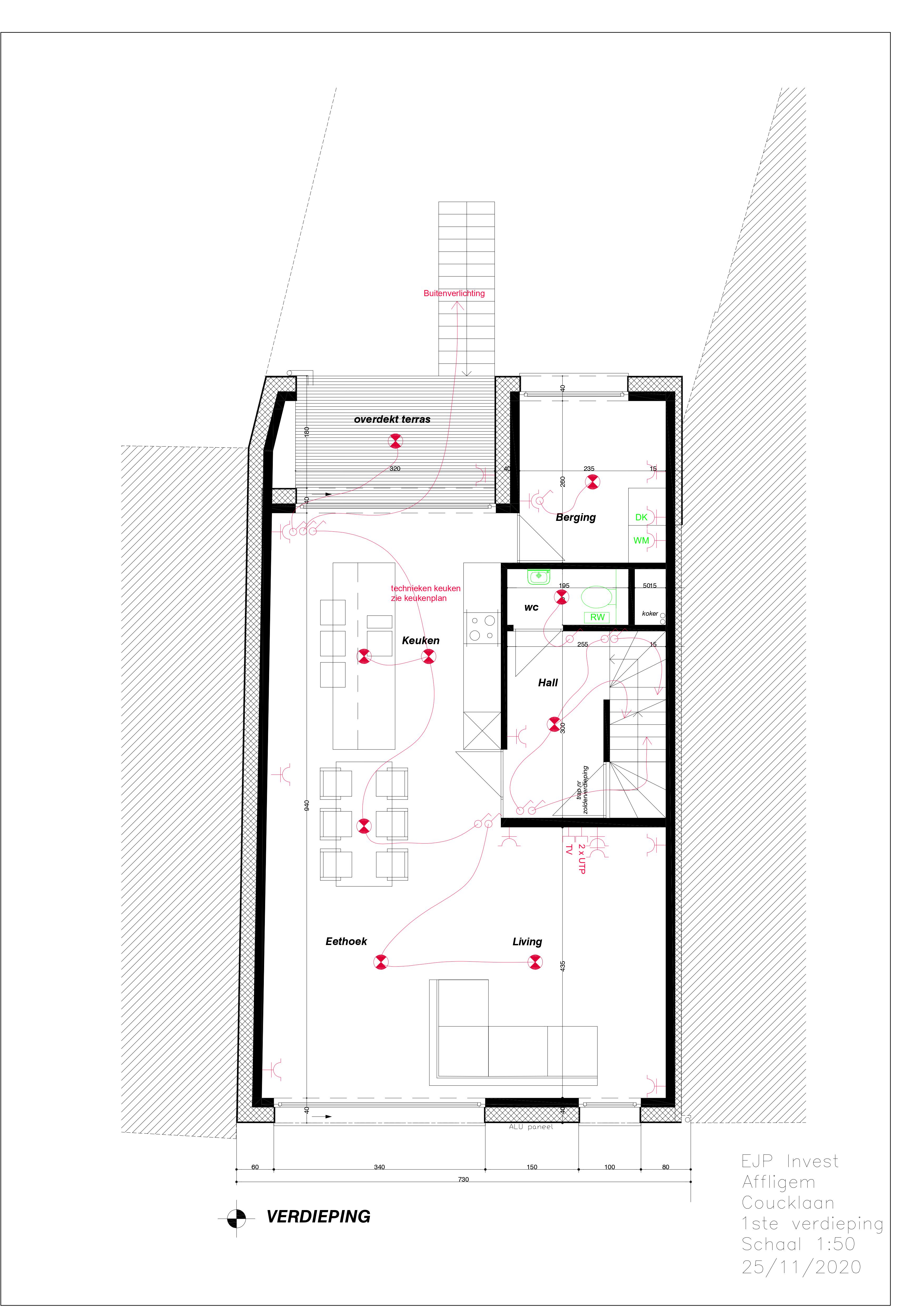 Le premier étage se compose d'un hall avec toilette et d'un spacieux espace de vie avec cuisine ouverte. Grâce aux grandes baies vitrées, vous bénéficiez ici d'une abondance de lumière naturelle et d'une vue unique et apaisante sur la Dender. Adjacent à la cuisine, on trouve une buanderie pratique et une terrasse intérieure.