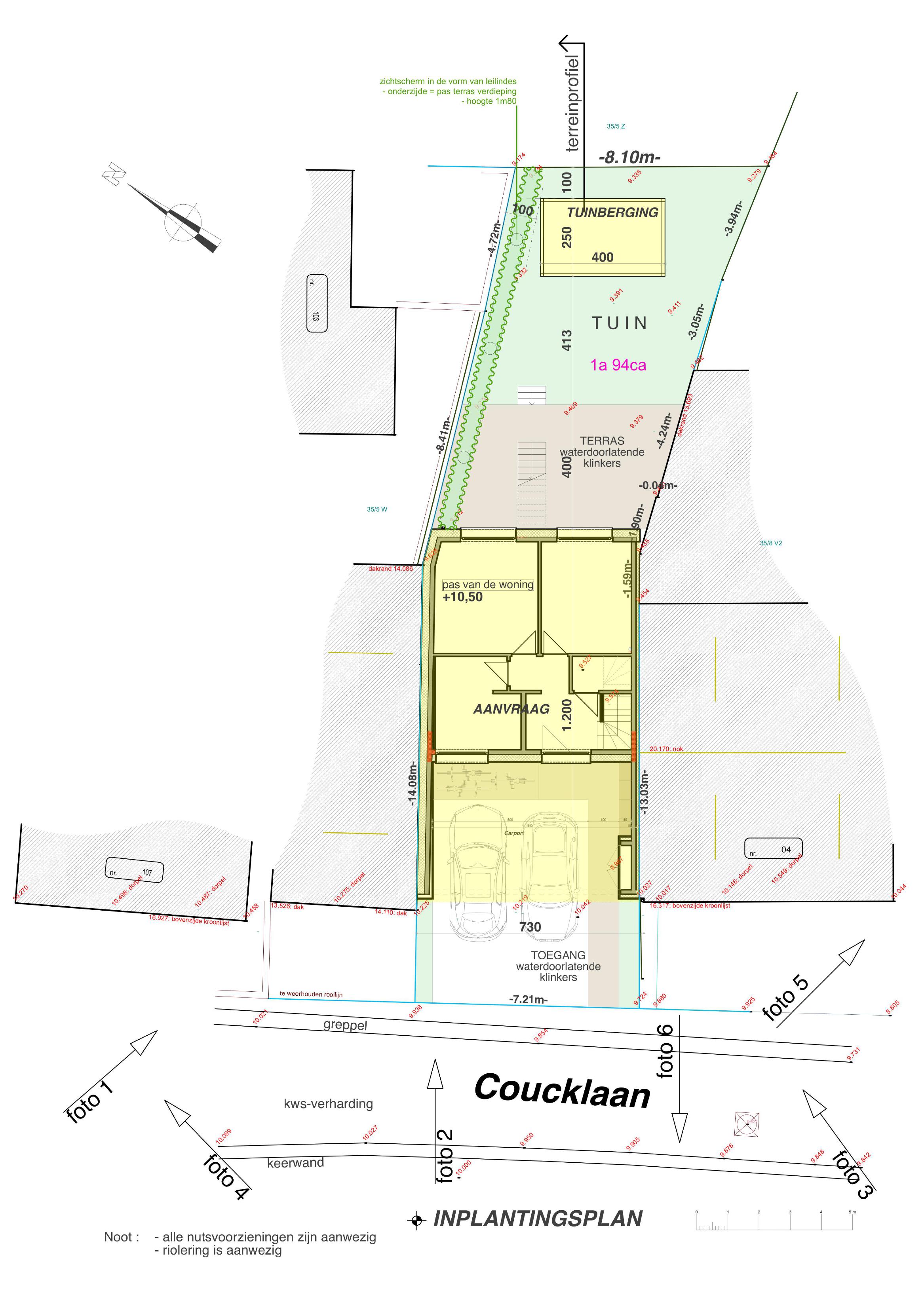 À l'avant, un abri pour 2 voitures et un local à vélos sont prévus.