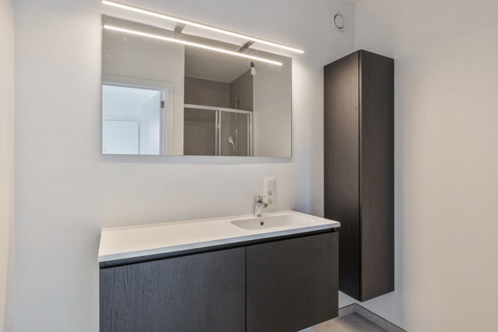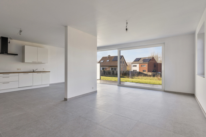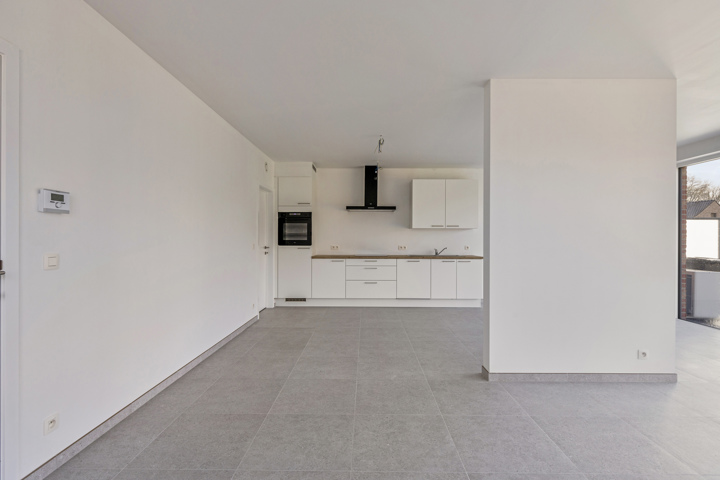 Indeling: Gelijkvloers: inkomhal (1,30m²), lichtrijke leefruimte met open keuken voorzien van een inductie kookplaat, dampkap, koelkast, enkele lavabo, oven en vaatwasmachine (46m²) met aansluitend het west gericht terras (21,50m²), technische ruimte/wasplaats (4,50m²), nachthal (6,50m), badkamer met enkele lavabo en inloopdouche (4,60m²), slaapkamer 1 (12m²) en slaapkamer 2 (12,70m²).