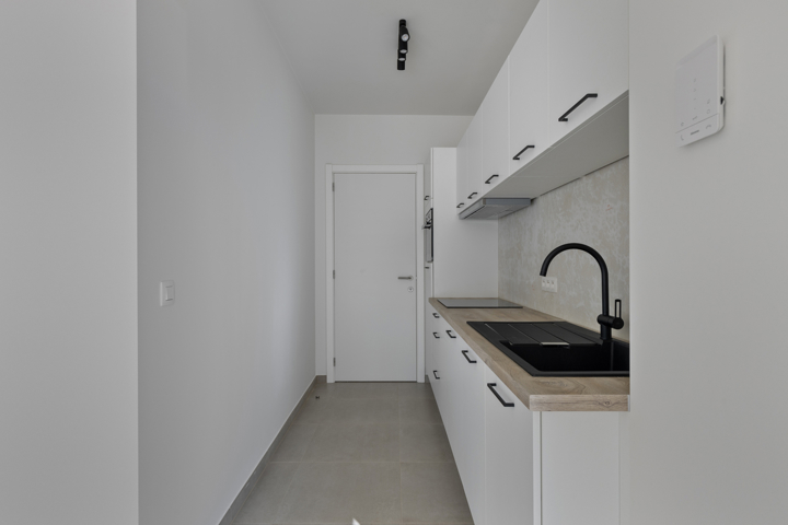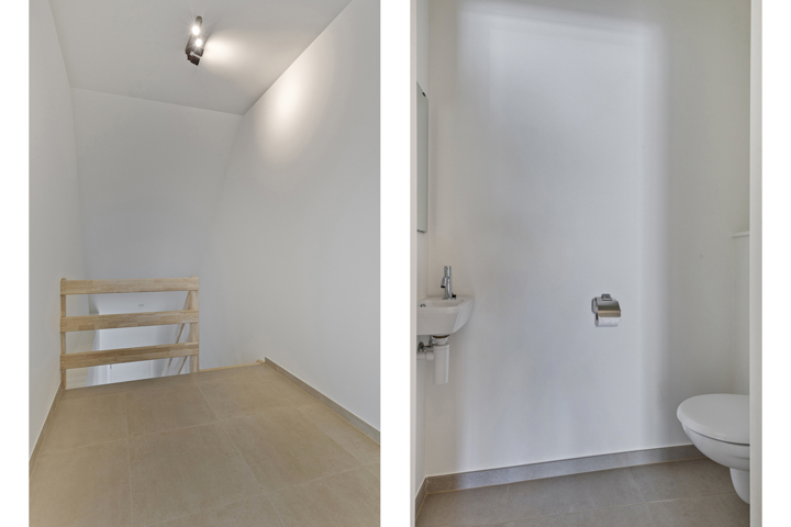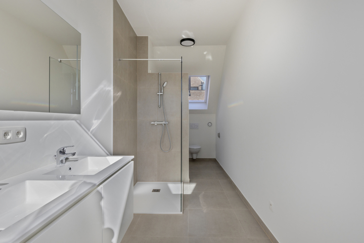 Indeling: gelijkvloers: inkomhal met gastentoilet (7,50m²), lichtrijke leefruimte met halfopen keuken voorzien van een inductie kookplaat, dampkap, koelkast, enkele lavabo, combi-oven en vaatwasmachine (5m²) en aanpalende berging/wasplaats (2,50m²). De leefruimte geeft toegang tot het aangename zuidoost gericht terras (10m²). Eerste verdieping: nachthal (5m²), badkamer met dubbele lavabo, ligbad, inloopdouche en toilet (11,30m²), slaapkamer 1 (22,60m²) en slaapkamer 2 (14,50m²). De woning werd reeds volledig professioneel geschilderd en voorzien van verlichting en raamdecoratie.