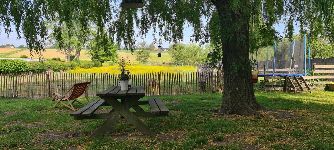 Buiten toegang tot extra garage en buitenberging. Er werden ook zonnepanelen geplaatst en de verwarmingsinstallatie werd volledig vernieuwd. Van onder de wilg kan u genieten van het prachtige zicht op de velden...Ideaal voor grote gezinnen, dierenliefhebbers, combinatie privé/zelfstandige activiteit, dankzij de goede bereikbaarheid.