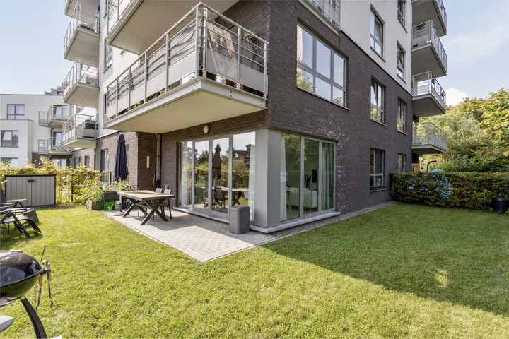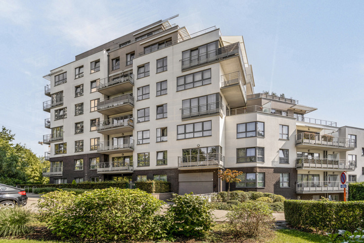 Het appartement bevindt zich op de gelijkvloerse verdieping vlakbij een lift, die toegang geeft tot de kelder (5 m2) en ondergrondse parkeergarage.