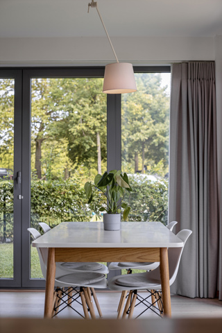 De grote ramen zorgen voor veel lichtinval en een aangenaam zicht op de tuin (105 m2).