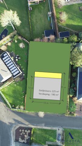 Breedte 23m aan straatzijde, biedt de mogelijkheid van het bouwen van een woning van 15m x 15m = 225m2 gelijkvloers