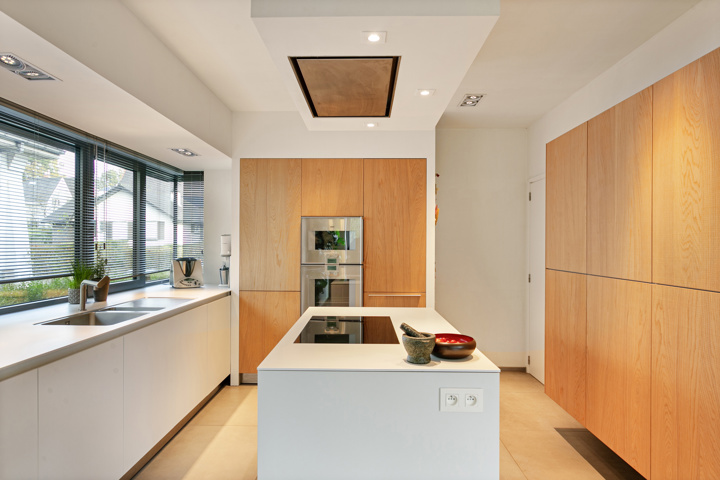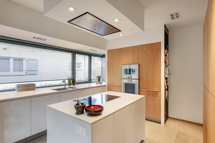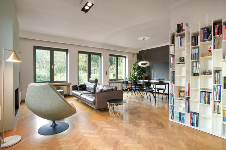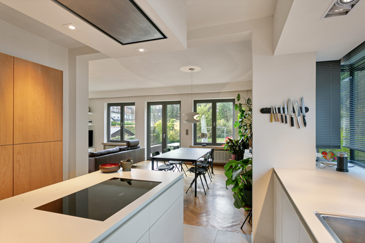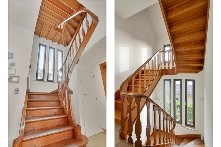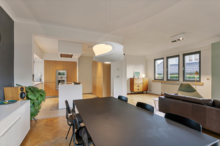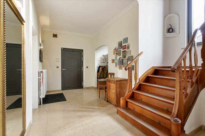 een impressionante inkomhal met gastentoilet die toegang geeft tot het bureau, lichtrijke open leefruimte die naadloos overloopt in de hyper uitgeruste keuken van Bulthaup. De Karaktervolle centrale draaitrap geeft toegang tot de bovenverdieping.