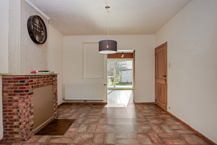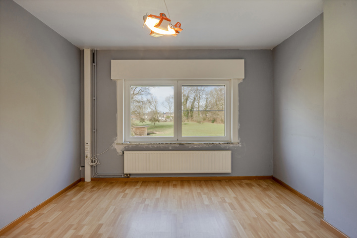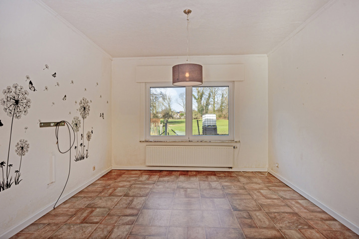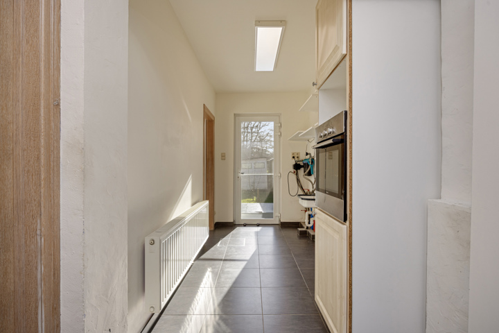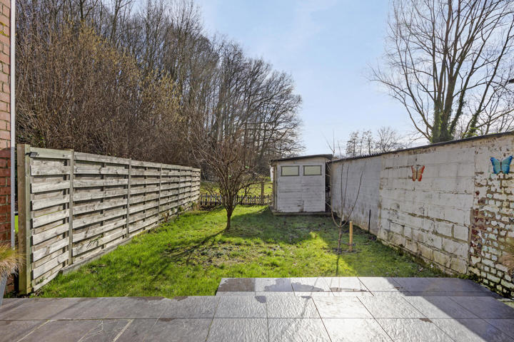 Deze eengezinswoning is ingedeeld in een inkomhal met toegang tot een kleine kelder , de lichtrijke leefruimte met annex de geïnstalleerde keuken welke uitkijkt op de tuin en het achterliggende groen. De keuken geeft toegang tot een zeer ruime berging en apart toilet. De voorzijde van de eigendom kijkt eveneens uit op de omliggende groene omgeving.