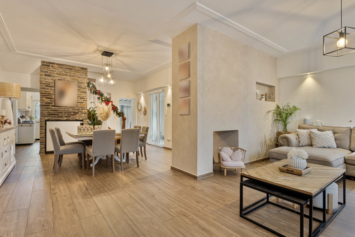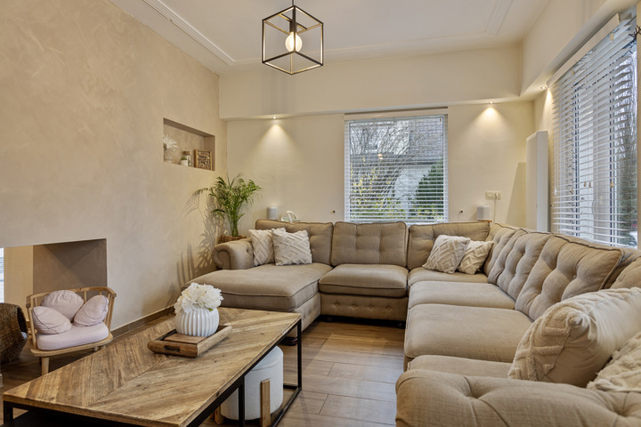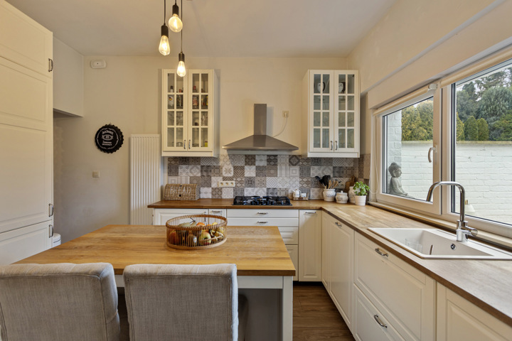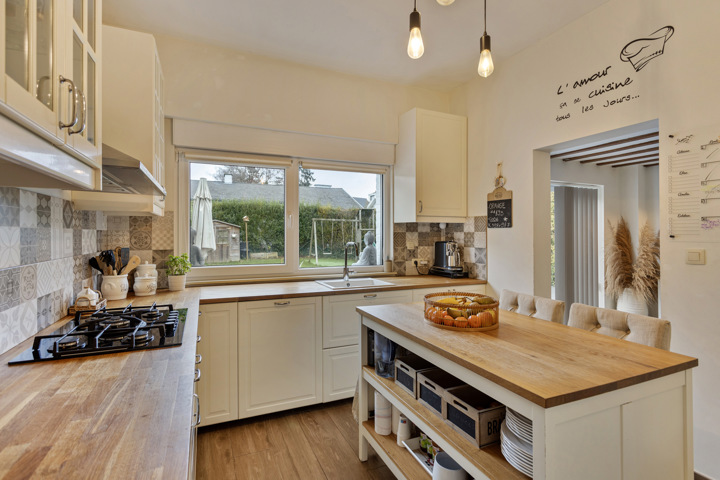 Bij het binnenkomen word je verwelkomd in een ruime inkomehal die uitgeefrt op de lichtrijke leefruimte(45m2) die naadloos overgaat in een moderne, open keuken. De keuken is voorzien van kwalitatieve inbouwtoestellen en biedt zowel zicht op als toegang tot de zonnige tuin en het aangename terras.