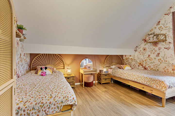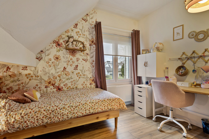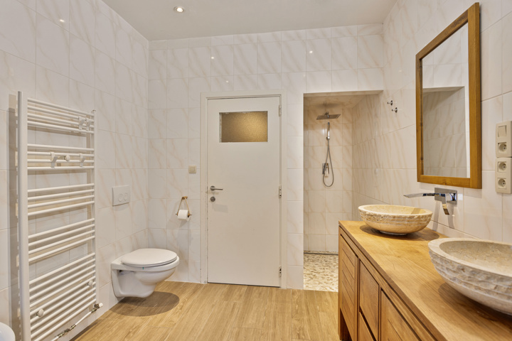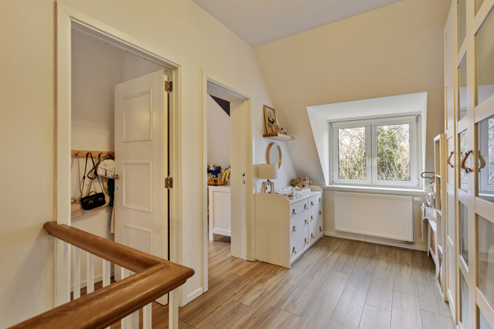 De eerste verdieping beschikt over drie ruime slaapkamers, elk met veel lichtinval en voldoende plaats voor kasten of een bureau. De volledig vernieuwde badkamer straalt luxe uit en is uitgerust met moderne voorzieningen zoals een vrijstaand bad en inloopdouche.