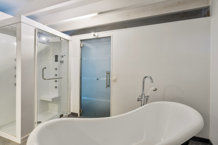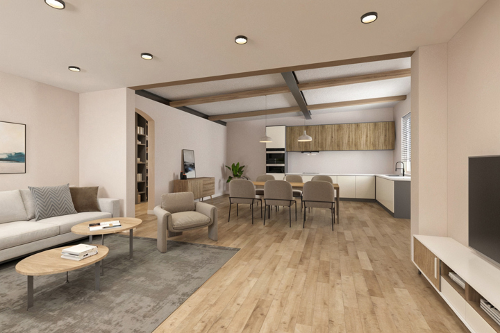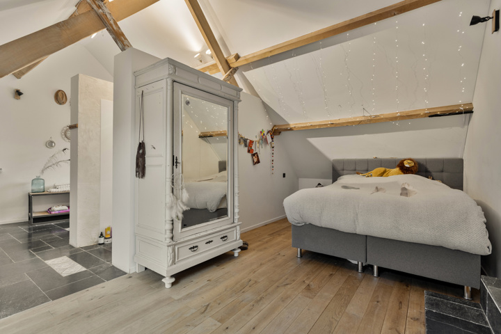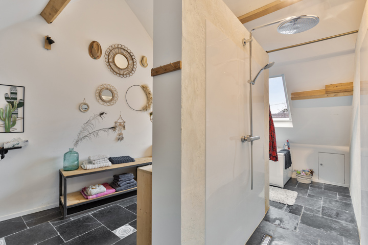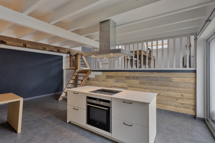 Het hoofdgebouw verwelkomt u met een ruime inkomhal die leidt naar de open leefruimtes met een open keuken en een veel praktische opbergmogelijkheden. De eerste verdieping werd ingericht als een royale loft met een master bedroom alsook aan de overkant van de overloop twee kinderkamers, wat zorgt voor een lichtrijke en open woonbeleving. Daarnaast bevindt zich in dit gebouw ook nog een ruime loft die bereikbaar is via een aparte toegang maar evengoed kan een trap geinstalleerd worden waardoor deze via de leefruimte bereikbaar is.