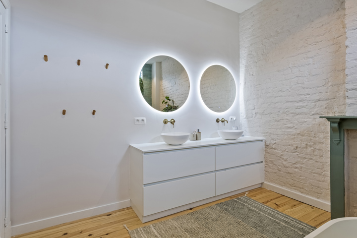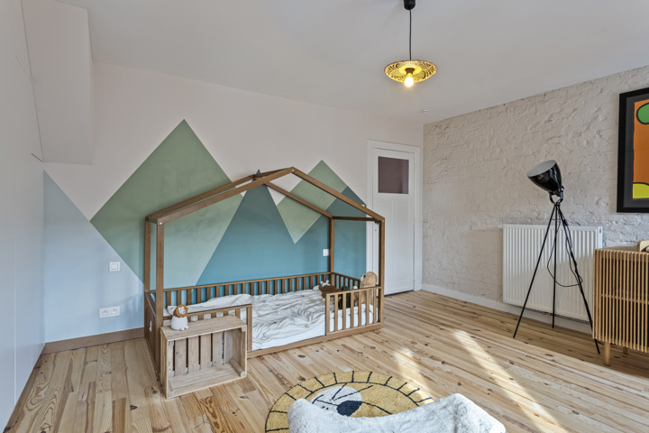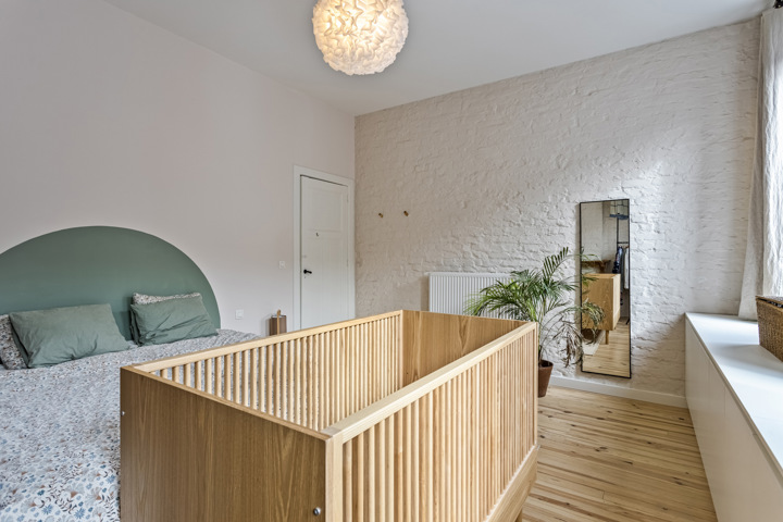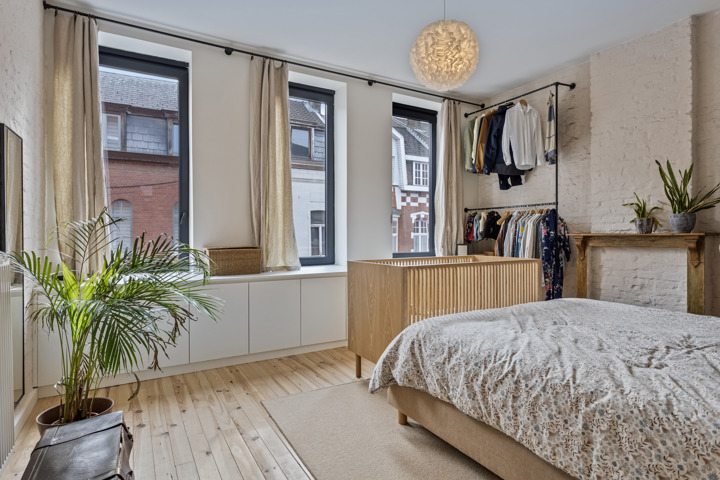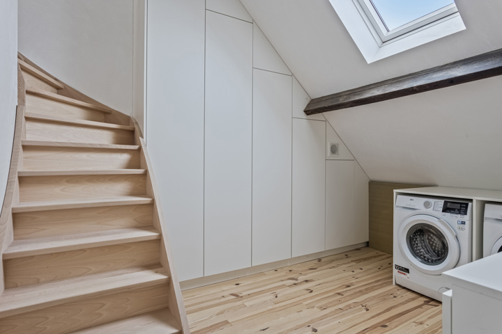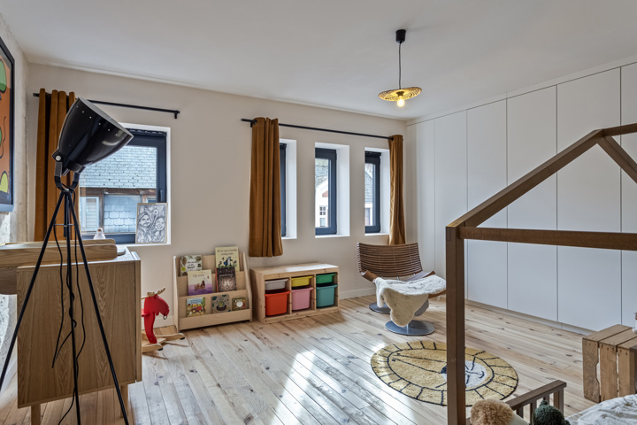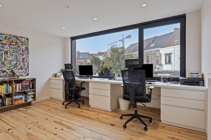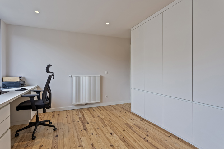 Op de eerste verdieping vindt u een bureau/slaapkamer met een volledige wand in maatkasten. Daarnaast vinden we een ruime badkamer met alle moderne comfort. De royale, lichtrijke slaapkamer van 25m² biedt een oase van rust en licht. Op de tweede verdieping bevindt zich een derde slaapkamer met eveneens de praktische wasplaats, volledig op maat gemaakt. Onder het dak ontdekt u nog een extra, lichtrijke slaapkamer.