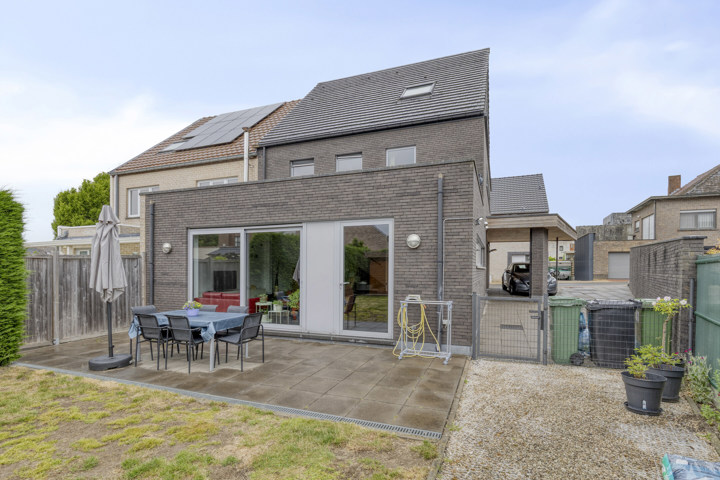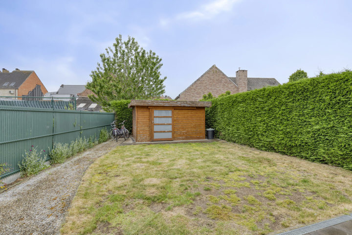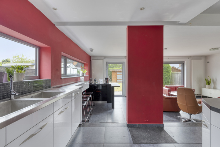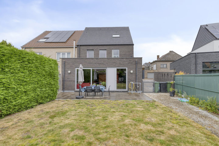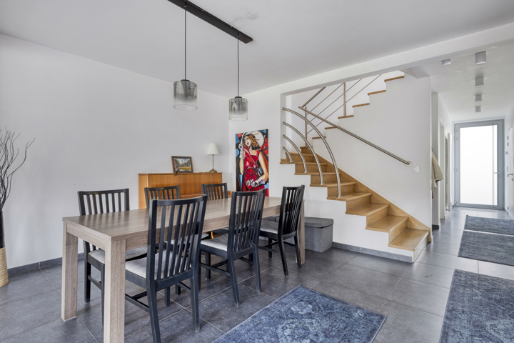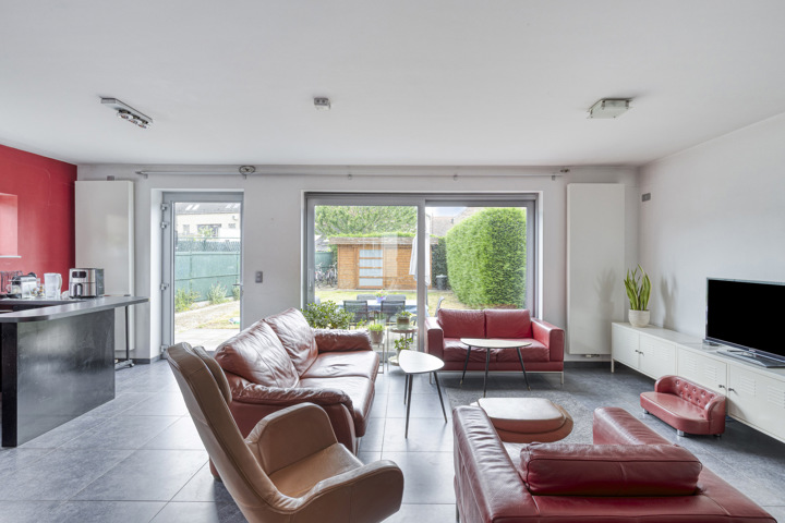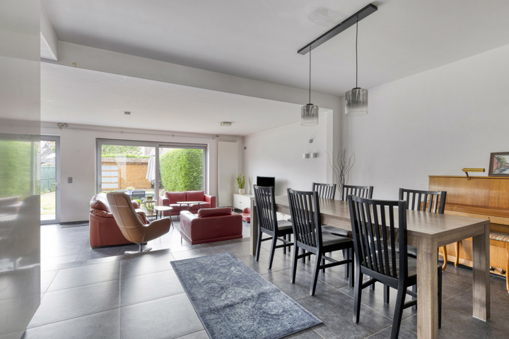 De open leefruimte is een absolute troef, met een aangename zithoek en een eetruimte die naadloos overgaat in de moderne, open keuken. Grote ramen zorgen voor veel natuurlijk licht en bieden rechtstreeks toegang tot de zonnige tuin – een perfecte plek om te ontspannen of gezellig te tafelen met familie en vrienden.