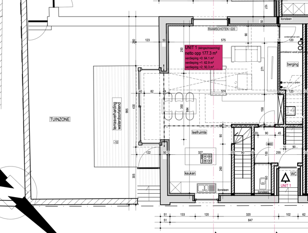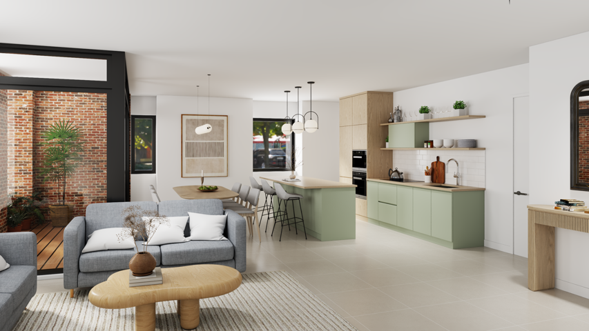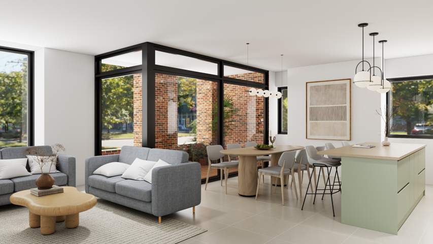 Bij het betreden van de woning komt u binnen in een lichtrijke inkomhal met gastentoilet. De open leefruimte vormt het hart van het huis en baadt in het licht dankzij de grote raampartijen die uitgeven op de privatieve tuin. De stijlvolle, volledig uitgeruste keuken vormt een harmonieus geheel met de leefruimte en is perfect voor gezellige avonden of het ontvangen van gasten.