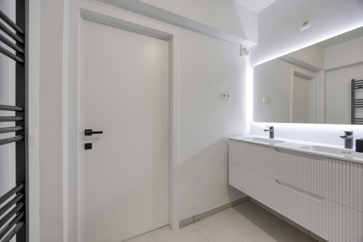 Bij het binnenkomen word je verwelkomd door een stijlvolle inkomhal met apart gastentoilet en een luxueuze badkamer. De twee ruime slaapkamers liggen aan de rustige achterzijde en geven toegang tot een zonnig terras – ideaal om te genieten van de buitenlucht in alle privacy.