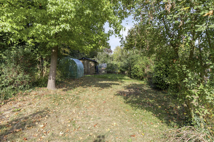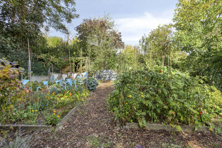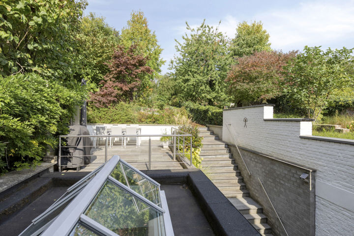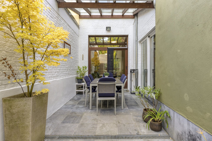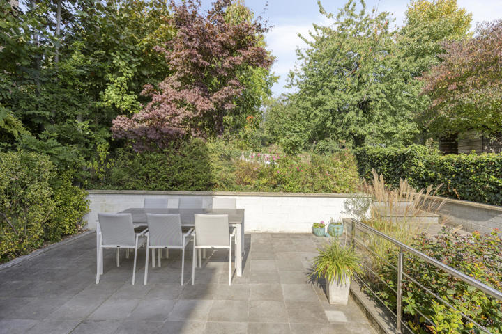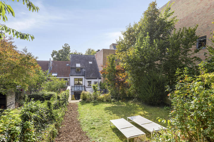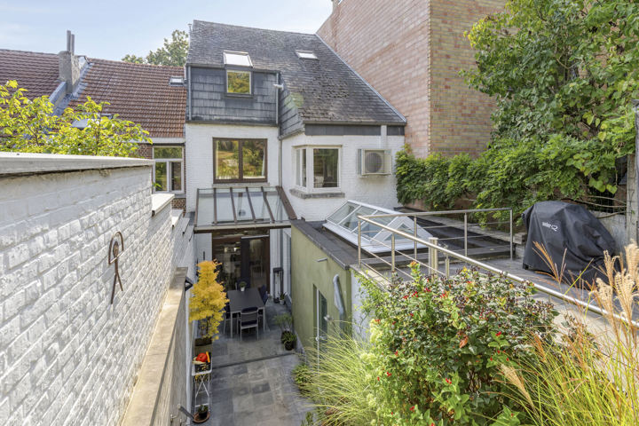Binnenin wacht een ruime, lichtrijke leefruimte met aparte bureauhoek en eetkamer. De recente keuken (volledig vernieuwd in 2012) is uitgerust met moderne toestellen en geeft rechtstreeks toegang tot het eerste, schaduwrijke terras — ideaal tijdens warme zomerdagen. Een trap leidt verder naar het tweede, zonovergoten terras en de diepe, groene tuin met achteraan een volwaardige moestuin. Een zeldzame oase van rust in de stad!
