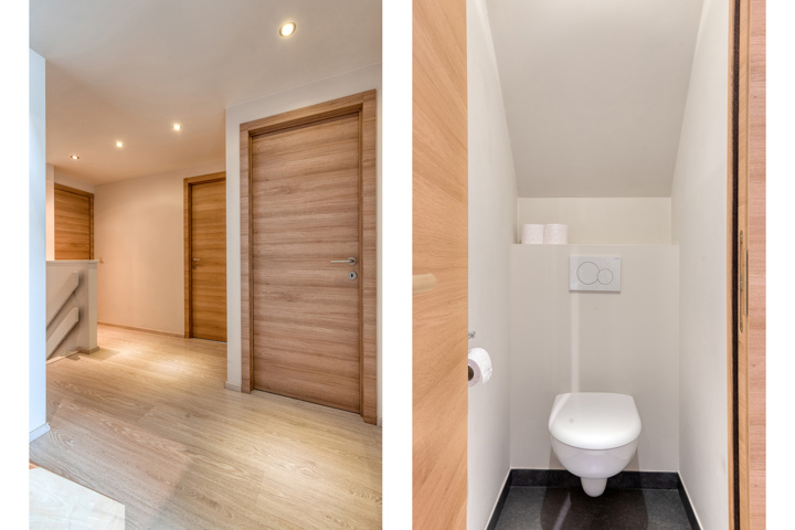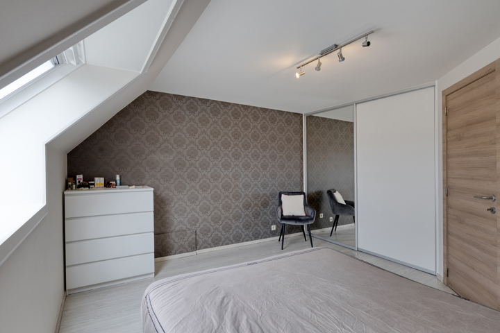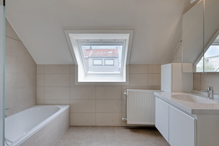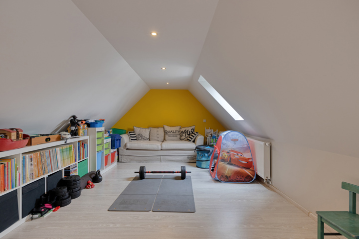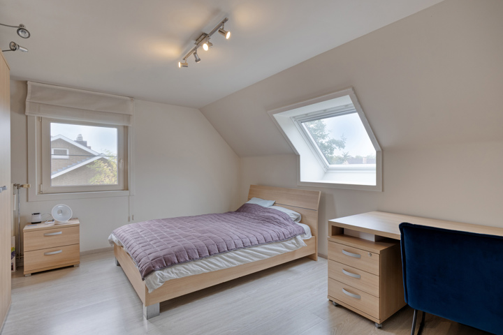 De eerste verdieping omvat een nachthal, een apart toilet, een badkamer met ligbad en douche, en drie ruime slaapkamers. De volledig afgewerkte zolderverdieping, bereikbaar via een vaste trap, doet dienst als vierde slaapkamer of hobbyruimte.