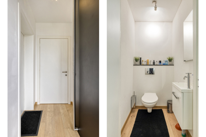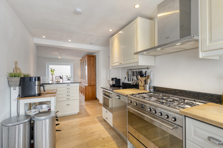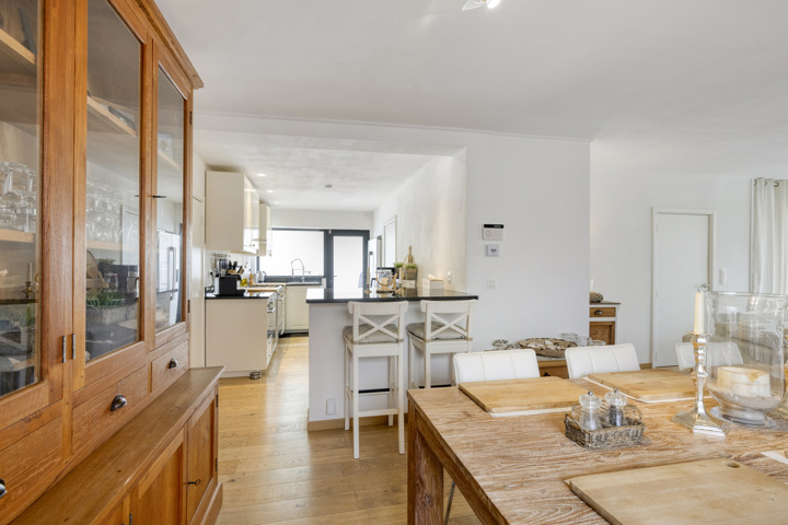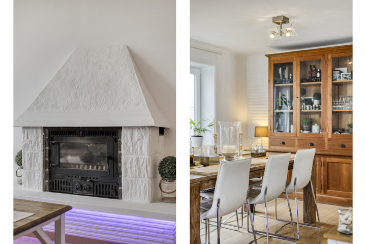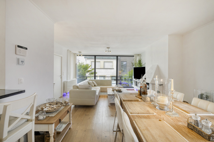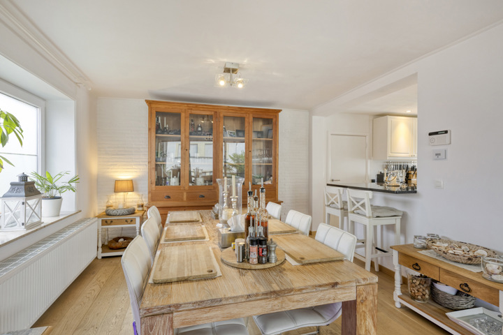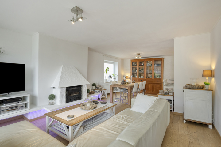 Binnenin word je verwelkomd door een lichtrijke leefruimte met gezellige inbouwhaard en eiken parketvloeren die zorgen voor een warme sfeer.