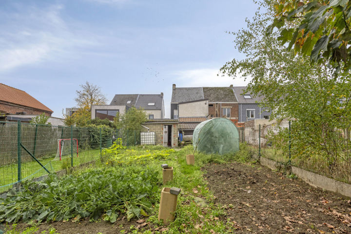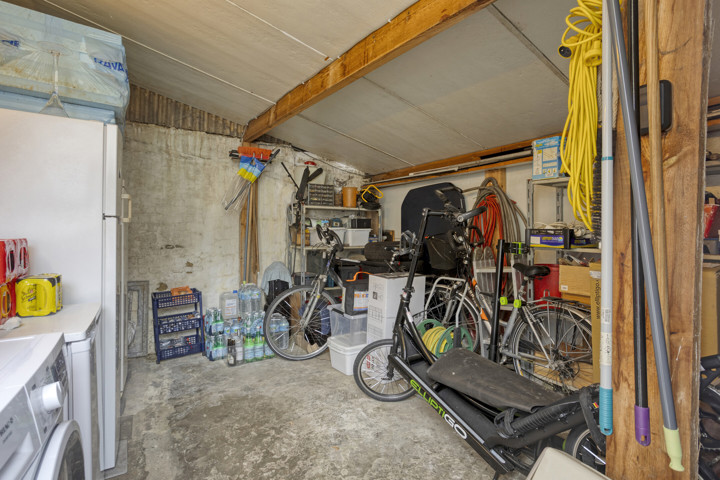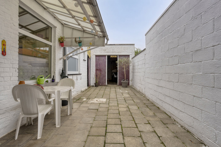 Aan de zijkant van de woning is een smalle oprit, geschikt voor fietsen, een motor of een kleine wagen. Daarnaast beschikt de woning over een garage met berging, wat extra opbergmogelijkheden biedt. Achteraan ligt een aangename tuin, gunstig georiënteerd en perfect om in alle rust te genieten van de buitenruimte.