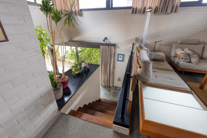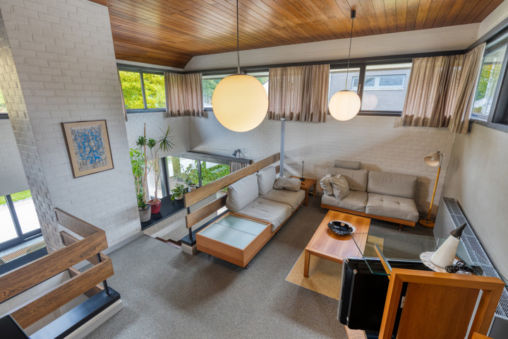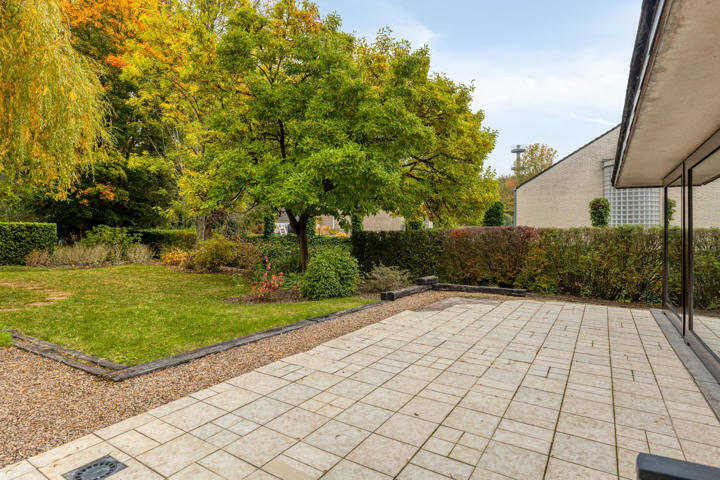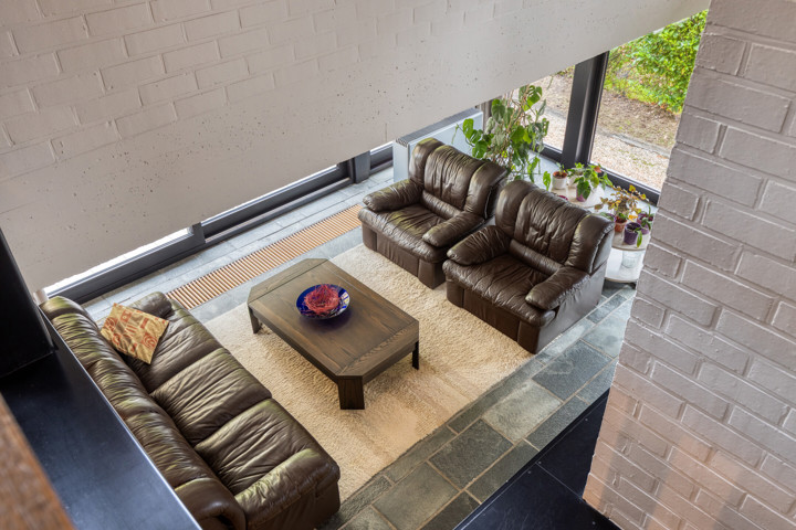 Een half verdiep lager bevindt zich een gezellige zithoek, ideaal om tot rust te komen met zicht op de tuin. Op de benedenverdieping vindt u de lichtrijke leefruimte met open haard, waar grote ramen zorgen voor een prachtig uitzicht op de achterliggende groene omgeving. De leefruimte sluit naadloos aan op het terras en de ruime tuin, perfect voor wie graag buiten vertoeft.
